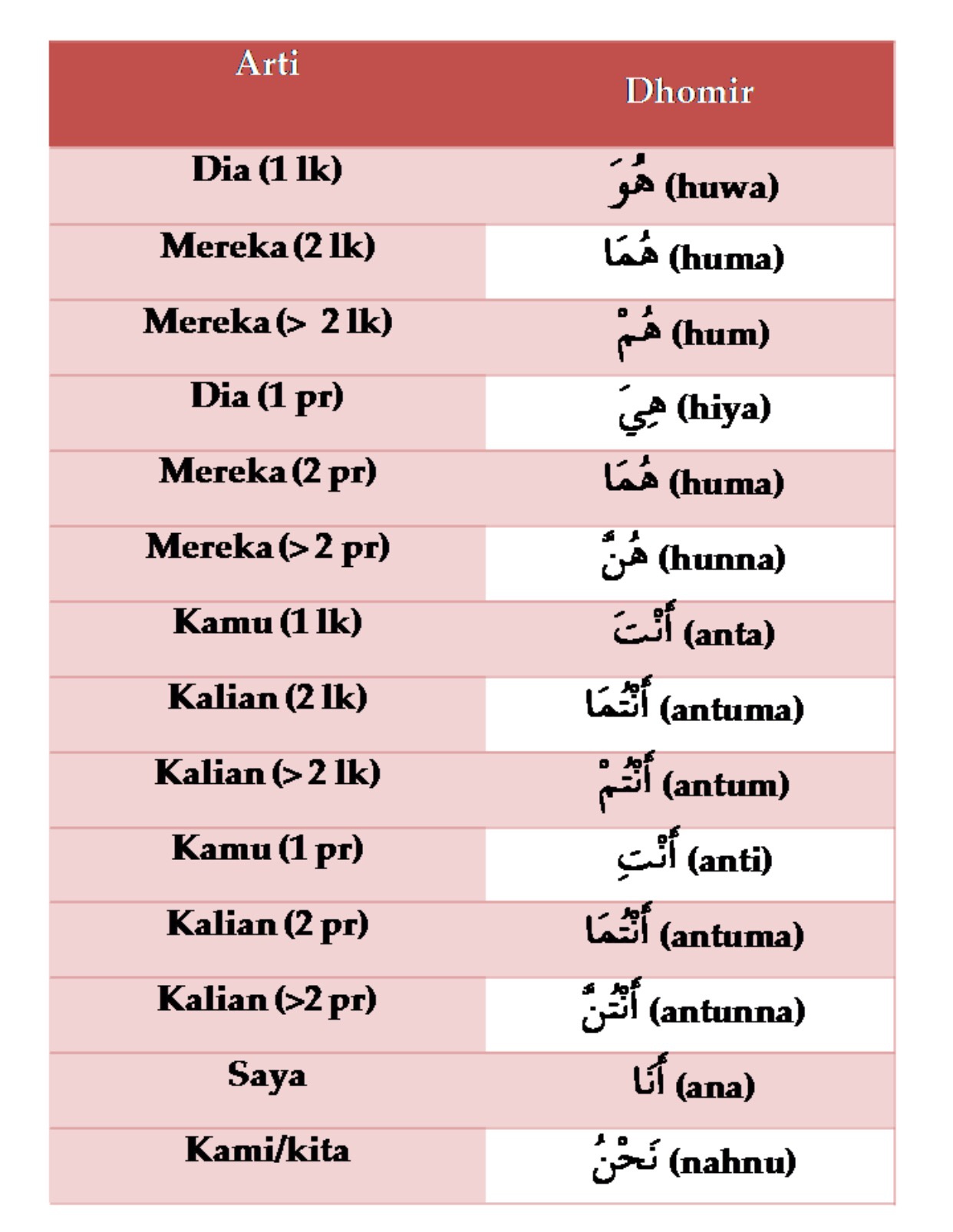 Dan dari 14 dhamir ini dibagi menjadi 3 kategori kata . Kalian yang mau belajar bahasa arab tentu pernah terlintas pertanyaan apa bahasa arabnya .